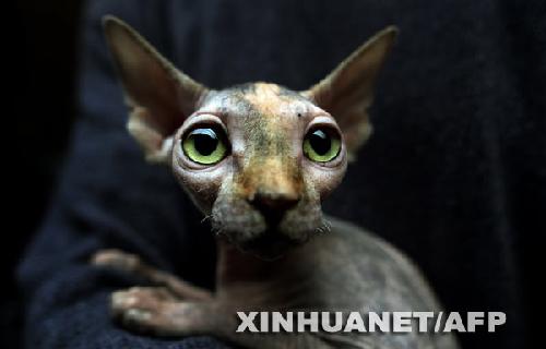 2008年11月15日,一只加拿大无毛猫在保加利亚索非亚举行的猫咪选美大赛上进行展示。