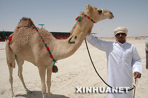 2008年4月2日,一位骆驼“选美”比赛的参加者在阿布扎比的扎耶德城展示他的骆驼。阿布扎比骆驼“选美”比赛当天在阿拉伯联合酋长国7个酋长国中最大的酋长国――阿布扎比酋长国的扎耶德城开赛,来自海湾地区的沙特阿拉伯、卡塔尔、科威特、巴林、阿曼和阿联酋的上万峰骆驼将在历时9天的比赛中角逐各组冠军。