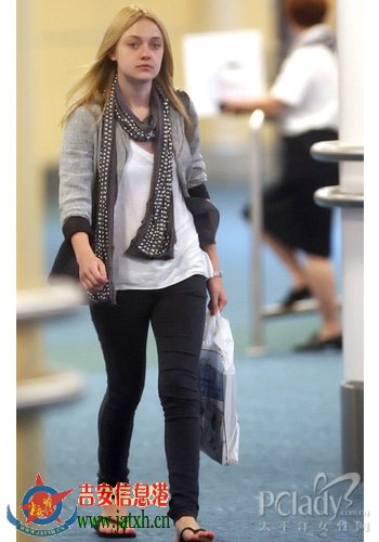 Dakota Fanning只用最简单的灰色小西服搭配白色T恤、紧身牛仔裤,铆钉装饰的围巾凸显整体造型的层次感及搭配趣味。