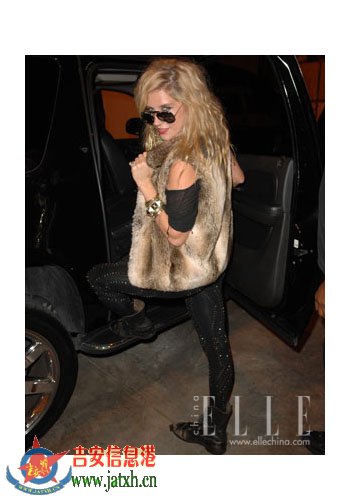 钱妞的装扮总是那么惊世骇俗,虽然不及GAGA的造型来得异类,但也足以把正常的人类吓一跳了。不过她这身造型却还算正常,皮草背心和镶有水晶亮钻的黑丝袜都带着贵族的奢华气息,不过却偏要搭配一双旧旧脏脏的系带短靴,再加上黑超墨镜和红唇妆,浑身透着妖冶危险的气息。