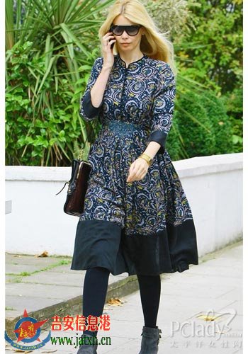 同样是在伦敦的街头,Claudia Schiffer这次选择以长袖连衣裙现身,细带的肩挎方包与麂皮短靴的搭配,加上连衣裙上繁复而华丽的图案,轻易就能带出极具现代感的复古味道。