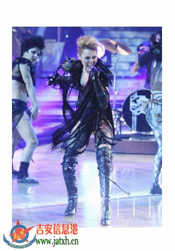看吧!捆绑式长靴就是那么受到舞台的欢迎,和同样拉风的长流苏紧身衣搭配真是天衣无缝,紧紧拉住观众的视线。鞋带和流苏一起随着Miley Cyrus的动作而甩动,充满动感和激情。