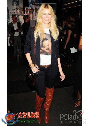 同样的棕色长靴,既使在黑色的背景下也一样出彩。黑色的小西服搭配紧身裤,同色系的肩挎包、编织款腰带和长靴让全身造型更具线条感,及肩的金色长发更是不可多得的点缀。
