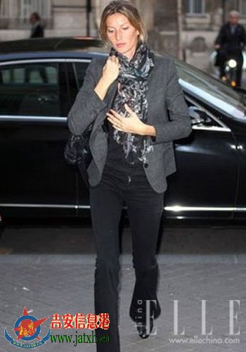 灰色的软呢西装外套虽然不是长款的款式,但却应为硬朗的线条与灰色的大气沉稳而显得更加帅气。搭配黑色瘦腿喇叭裤与一挑碎花纹丝巾简单清爽。