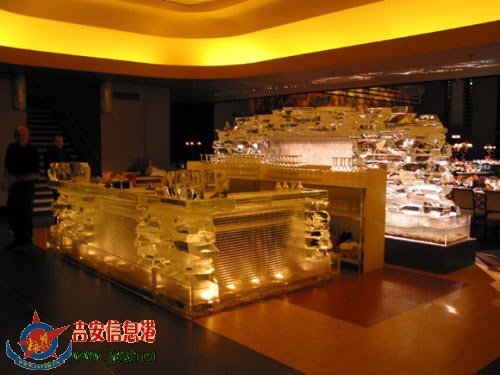 “另类的奢华”—三座酷似瀑布的冰雕吧台与其身后的冰雕瀑布相互映射,奢华之极。