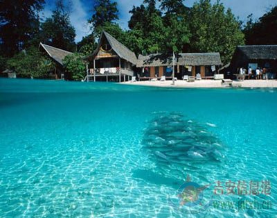 750美元5天4晚的套餐价格看上去有点贵,不过这已包括了吃、住、行及娱乐、交通的一切费用,比早两年的1300美元便宜多了。而且住的是名副其实的水上屋———整个木屋都悬在美丽的海水之上。每天的生活大致可以这样安排:白天玩浮潜,吃过天天不同风味的自助餐后,懒洋洋地看鱼儿在脚下觅食、打架,然后搬把椅子,在屋顶或海边晒太阳。