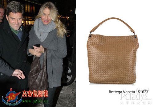 初看到Cameron Diaz 背的这款包,不用看LOGO就能知道是什么品牌的,因为Bottega Veneta特有的编织设计就是最好的标志。这款类似桶装的的小羊皮编织包是BV代表作,BV的皮包强调手工限量生产,仰赖纯熟的编织技艺完成。制作时,由熟练的裁缝先检查整块皮革厚度是否一样、颜色分布是否均匀,然后将两块皮革黏合,再切成一条条像意大利面条般的条状,用手工折出皱折,再编织成皮包。完全看不到接缝线,没有20年以上编织手艺的师傅很难胜任。这就是好莱坞明星们倾心的原因,要的就是这种独有的尊贵感。卡梅隆·迪亚兹(Cameron Diaz)带的这款手袋棕色的手袋搭配她一身黑色的装束既不扎眼又不沉闷,兼具了装饰性和配合整体干练风格的效果。