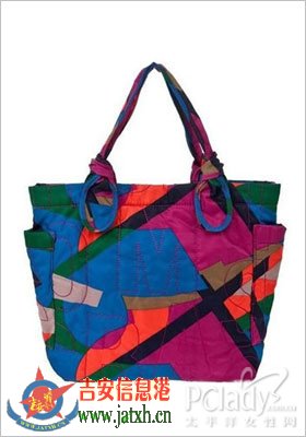 这款Marc by Marc Jacobs可谓有点百家布的影子,多种颜色的夹棉布以不规则的形态组合在一起,完全找不出任何规律,上面还用针线绣上偌大的英文字母,显得特别年轻,特别好玩。就连肩带也不放过,同样是使用了包包的夹棉面料,勾织出温暖的亲切感,同时也让包包的重量变得更轻,背着它,就能轻松地享受浪漫假期了。