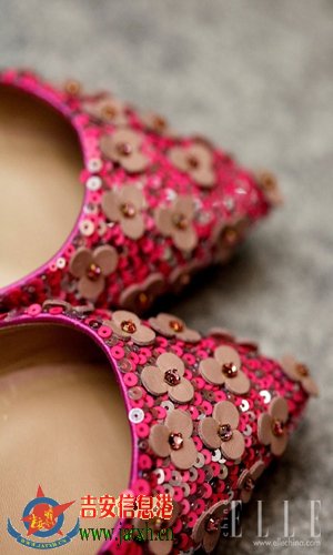 花蕊形的细跟浅口鞋上珠饰点点,为全套春夏新装画上点睛之笔。