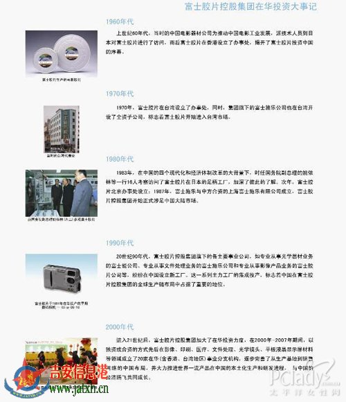 事业的全球化发展,让富士胶片也来到了中国。从1984年进入中国设立北京事务所开始,富士胶片已经在影像、医疗健康、印刷、光学镜头、文件处理、电子材料、平板液晶显示屏材料等多个产业开展业务,在华投资(含香港、台湾地区)已超过45亿元人民币,投资企业近40家,在华企业员工近18000名。