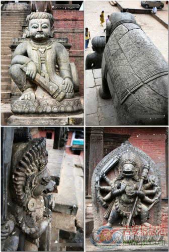 就这样,吉祥天女一直以威风凛凛的姿态雄踞着广场,而她的丈夫——毗婆奴的纳拉扬神庙(TIL MAHADEV NARAYAN)其实就一直隐藏在她对面的楼间。这座两层屋顶的纳拉扬神庙不太好找,要穿过民居的门洞才能见到。然而,它却是香火最旺也是尼泊尔最古老的神庙之一。它大概建于1080年,门口硊拜着坐骑葛鲁达鸟,还有毗湿奴的法器——海螺与轮盘。看来,在这夫妻一前一后一隐一显的夹击下,再恐怖的湿婆也无力回天了。