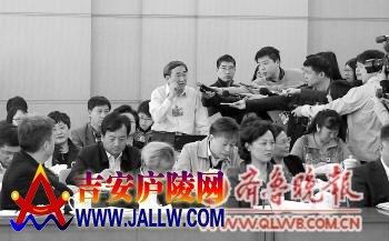 3月7日,在全国两会教育界联组讨论现场,葛剑雄向教育部部长袁贵仁提出考研试题泄露事件,要求教育部给出答复并道歉。(资料片)本报记者杨凡摄