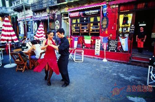 布宜诺斯艾利斯华灯闪耀的夜晚远比阳光明媚的午后更加迷人。黄昏的卡米尼托街上,撩人的探戈名曲缓缓响起,有点忧伤,还有点惆怅。循声而去,街头拐角处,一对身材高挑的青年男女正在翩翩起舞。头戴黑色礼帽、身着黑色礼服的英俊男人右手搂着曼妙女子的纤纤细腰,两眼直视前方,开始滑步,脚步沉稳。而女子在流淌的乐曲中则犹如配角温顺地随着男人旋转,两人时而前进、时而后退、时而向左、时而向右地滑动着双腿,交臂而舞,忽快忽慢。他舞步优雅,飘逸、洒脱;而她舞姿矜持、高贵,落落大方。眼前的探戈深沉华丽,谁又能想到,原始探戈充满肉体及欲望的挑动,曾是“下流东西”?