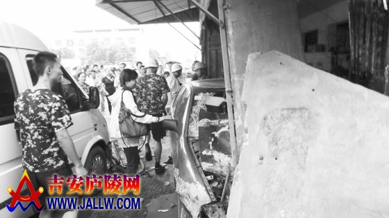 本报讯 罗顺龙、记者任洪广摄影报道:昨日上午10时许,青原区华能电厂附近发生一起交通事故。一辆轿车突然冲进路边一杂货店内,造成1人当场死亡、多人受伤的惨剧。