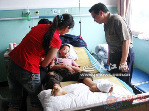 8日,记者来到吉安市中医院看到,彭菲当天早晨已从重症病房转到普通病房,躺在床上的他,鼻孔里还插着输氧管,其头部留有清晰的红肿擦伤痕迹,左脚还缠着纱布。