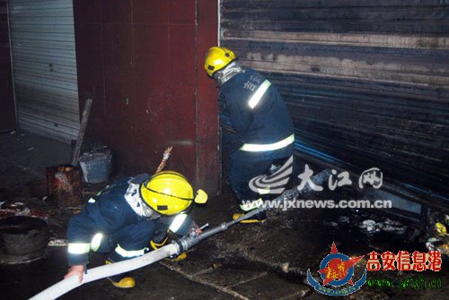 11日2时10分许,吉安市吉州区城北菜市场的一家烤鸭加工店内突然火光冲天,附近的店铺人员发现后立即报警。由于起火的烤鸭店大门紧锁,21名救火人员赶到现场后,将大门切割撬开进行灭火。经过20余分钟的扑救,大火被扑灭。据店主杨某介绍,当晚店里煤炉上放有一大锅卤水,起火原因可能是由于卤水烧沸时间过久引起的。