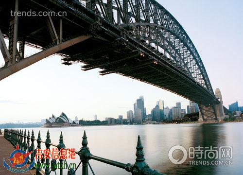熠熠生辉的悉尼拂晓——来自港湾大桥下人行道的惊鸿一瞥。早早起来,可以捕捉到如此精彩的瞬间。