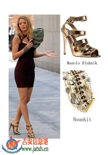 亮相产品:Manolo Blahnik金色高跟鞋、Bounkit多层手链