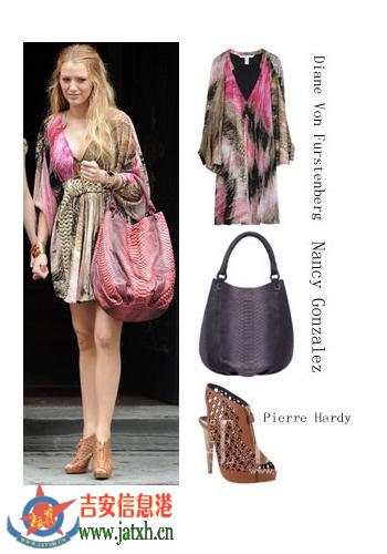 亮相产品:Diane Von Furstenberg印花连衣裙、Pierre Hardy网眼高跟鞋、Nancy Gonzalez蟒蛇皮手袋、Siman Tu手镯